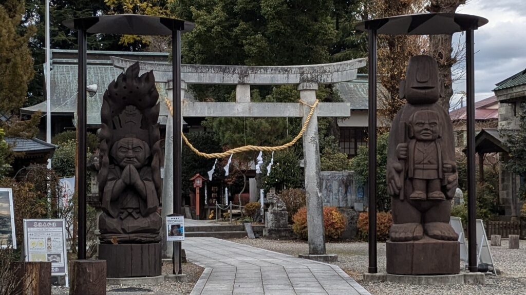 神社の二之鳥居の両脇には、尊徳来福像が奉納されています。特に左側の像の頭上には賽銭受けがあり、お願い事を念じて「来福来福」と唱えながら賽銭を投げ入れると願いが叶うという噂!