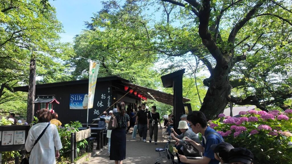 私たちも、あじさいをながめながら、くりみ入りみそだんごを食べて、ほっと一息。贅沢な時間です。