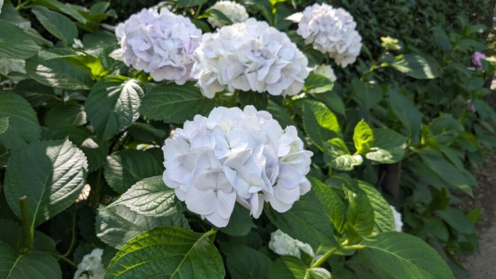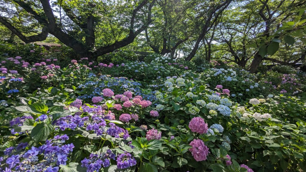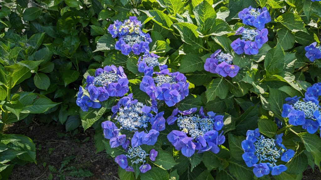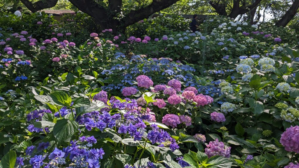 私が訪れたのは6月下旬の午前中。梅雨の晴れ間で日差しは柔らかく、湿った空気の中であじさいが一層色濃く輝いていました。