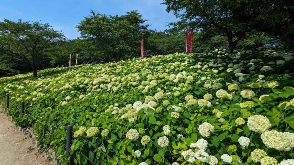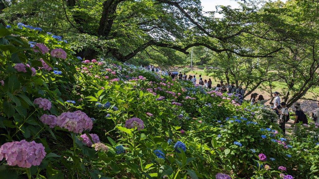 入り口付近では白いアナベルが一面に咲き、写真を撮る人で賑わっていました。堤を歩くと、右手に広がる紫や青のグラデーション、左手に続く桜並木の緑が美しいコントラストを作り出しています。