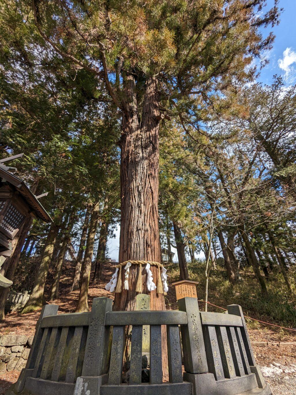 地上10メートル付近で二又に分かれている巨大な杉の木です。一つの根から生まれたこの木は「結びの杉」と呼ばれ、縁結びにご利益があると言われています。