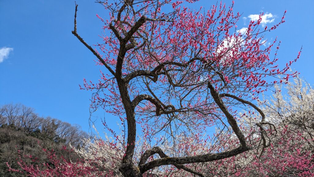 園内には約1,400本(※約700本と記載もあり要確認ですが、規模感として「千本梅林」とも呼ばれます)の紅白の梅が植えられており、山の斜面一面が梅の花で覆われる光景はまさに圧巻!