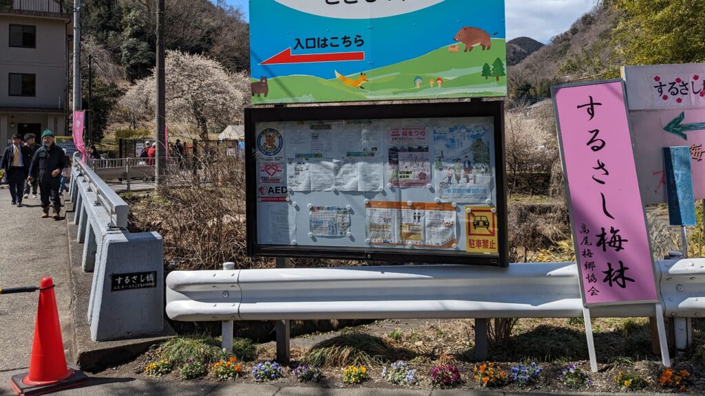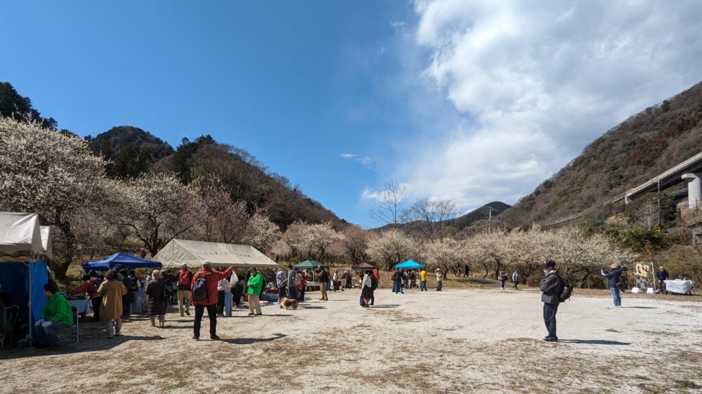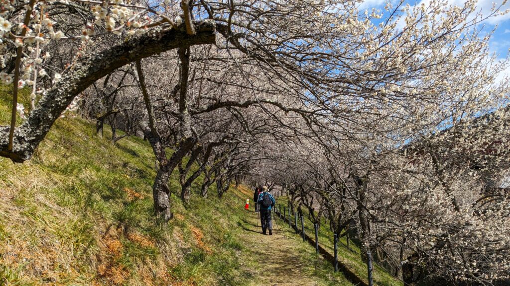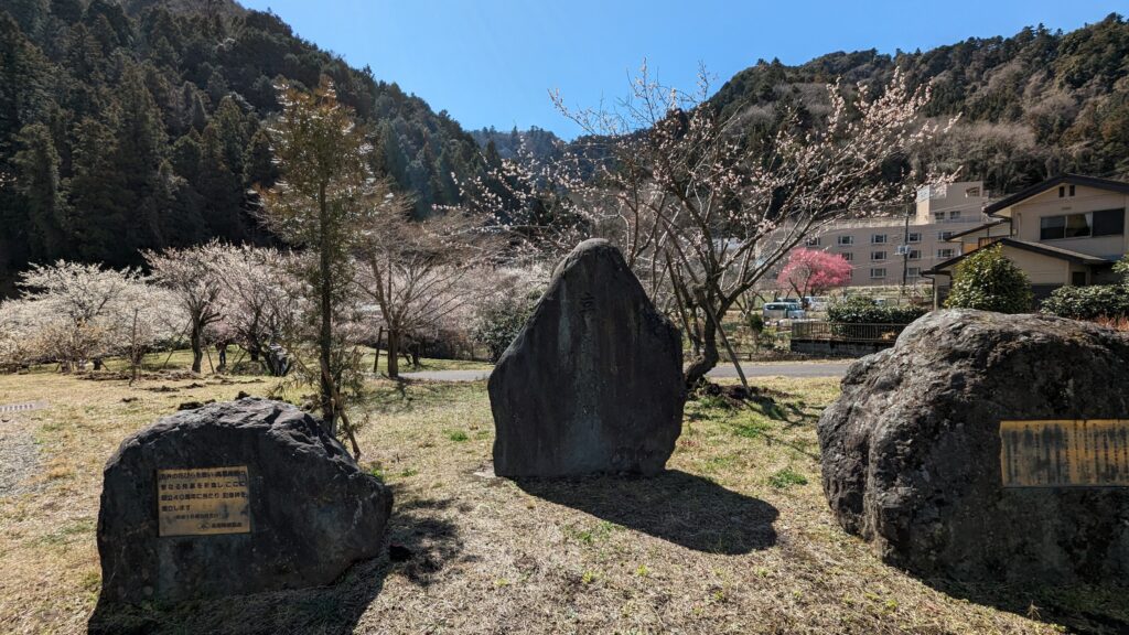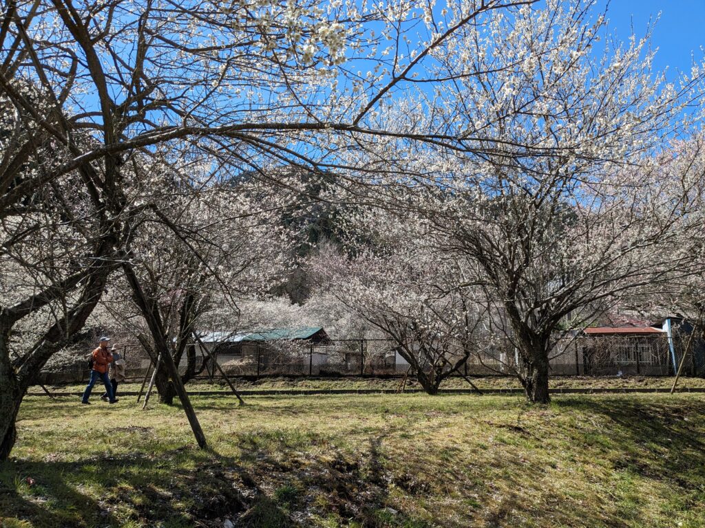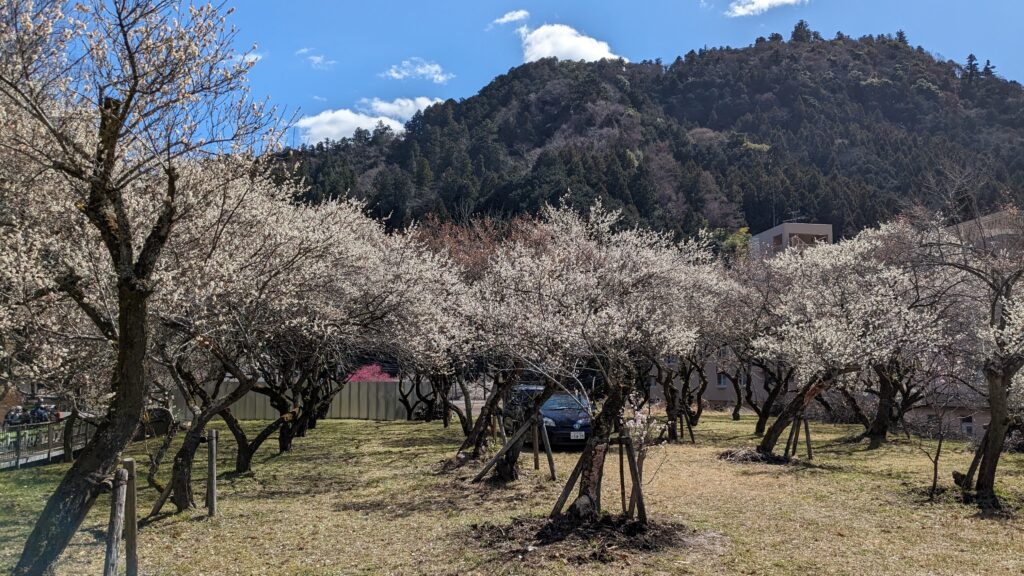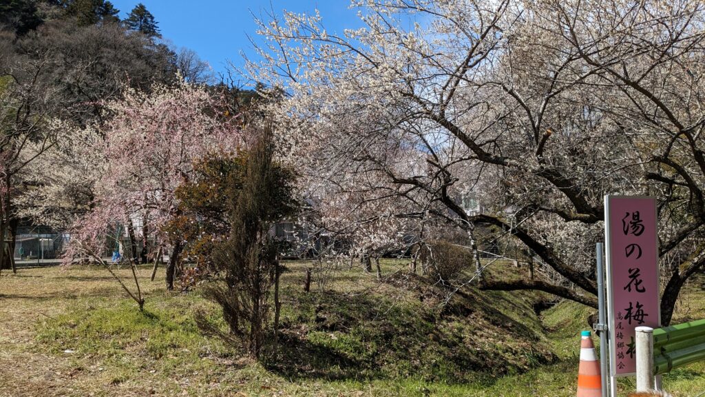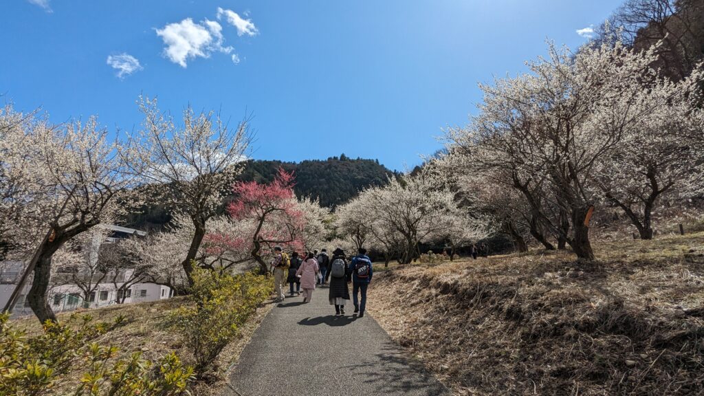 旧甲州街道を進むと、梅まつり期間中のみ開放される「湯の花梅林」、そして広々とした「するさし梅林(摺指まちの広場)」へと続きます。