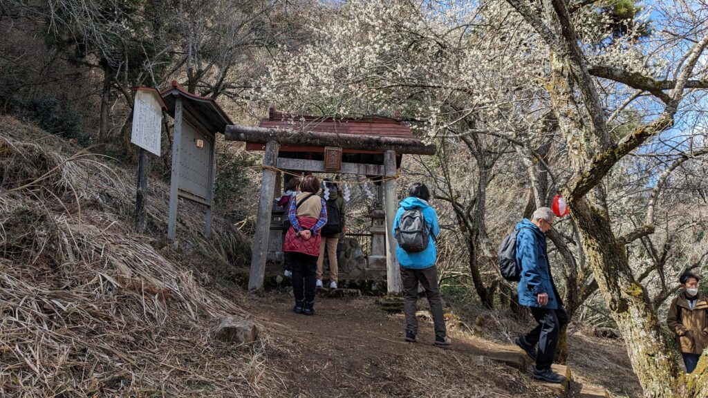 さらに10分ほど歩くと、「梅郷橋」の先に「天神梅林」が現れます。 山の斜面を少し登ると、藤原道真公が祀られている小さな社があります。「天神」という名前の由来ですね。