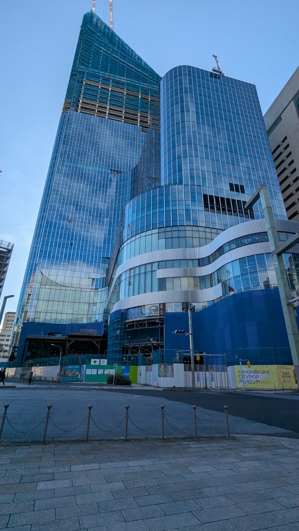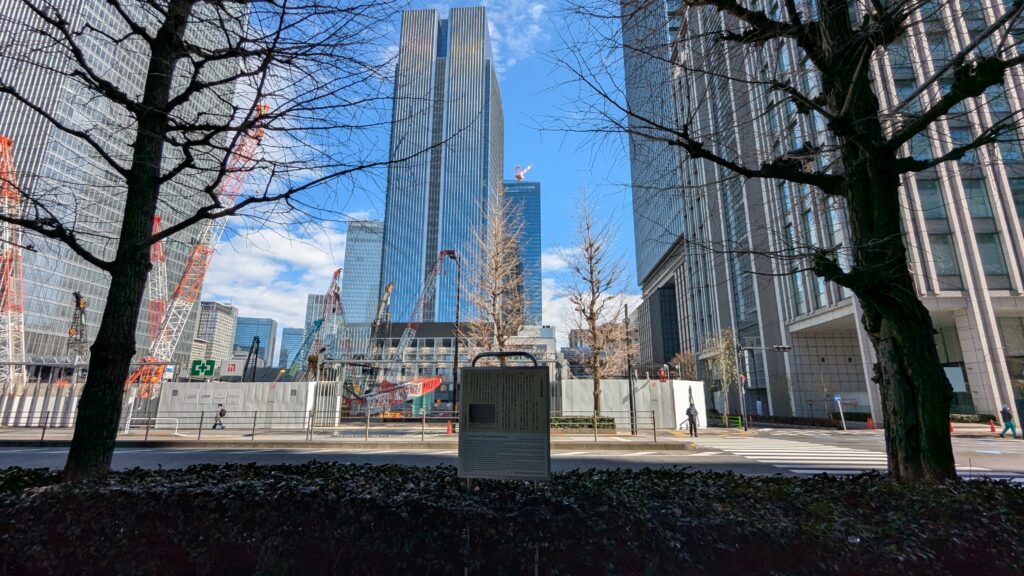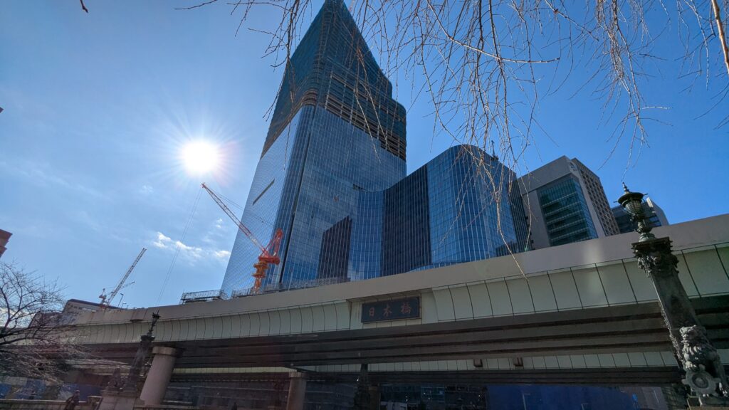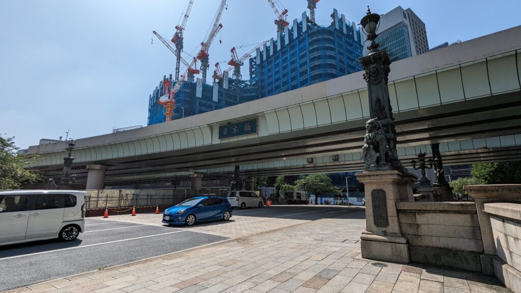 「日本橋由来記の碑」の向かい側、道路を挟んだ先には、先ほどの建設中のビルがその全貌を現します。昔の人は想像もできなかった光景だと思います。