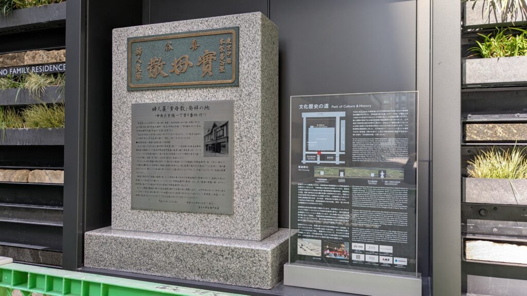 TODA BUILDINGの裏通りに回ると「歌川広重住居跡」「中橋狩野家屋敷跡」「實母散発祥の地」「文化歴史の道」の説明板がビルの壁面に展示されています。