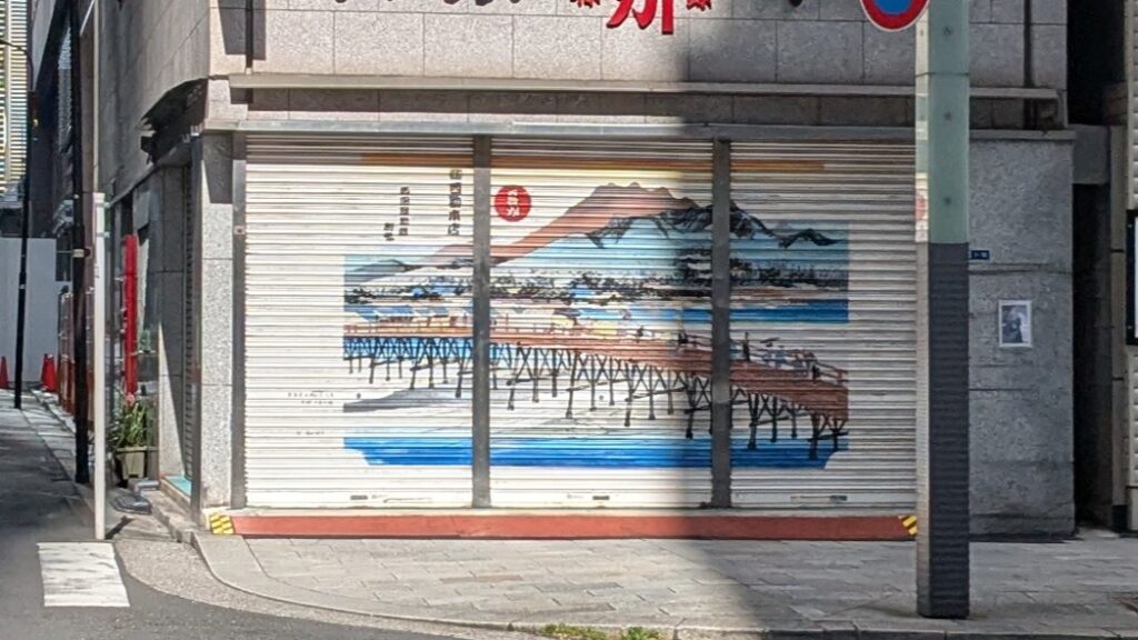 少し進んだところのお店のシャッターには、美しい浮世絵が描かれていました。ふとした瞬間に江戸の情緒が顔を出すのが、この街の面白いところです。