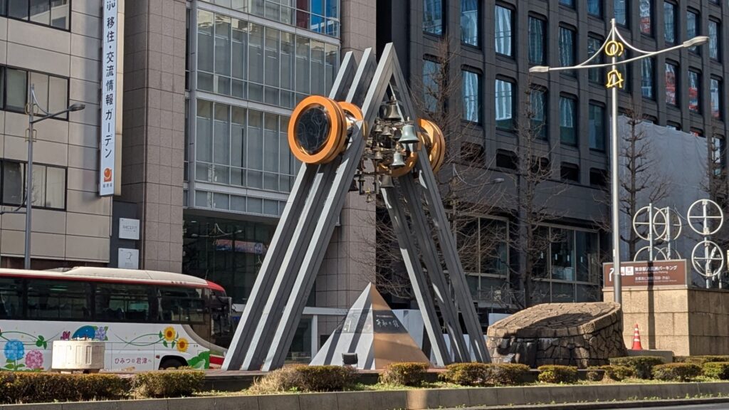 中央分離帯の三角形のモニュメントが平和の鐘です。中央区が1988年に「平和都市宣言」を行い、それを記念して建てられたものです。