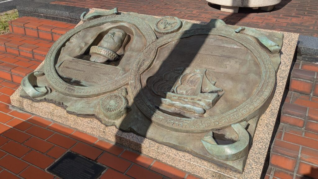 平和の鐘の手前にあるのが「ヤン・ヨーステン記念碑」です。ヤン・ヨーステンは、1600年に日本に漂着したオランダ人航海士です。徳川家康に重用され、外交顧問や貿易商として活躍、ヨーロッパの知識を日本に伝え、国際貿易の発展に貢献しました。