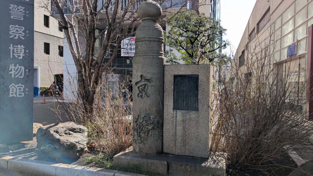 陸橋の左手前、警察博物館の前には「京橋の親柱」が誇らしげに立っています。かつてここには美しい京橋が架かっていました。今の風景からはなかなか想像できませんね。