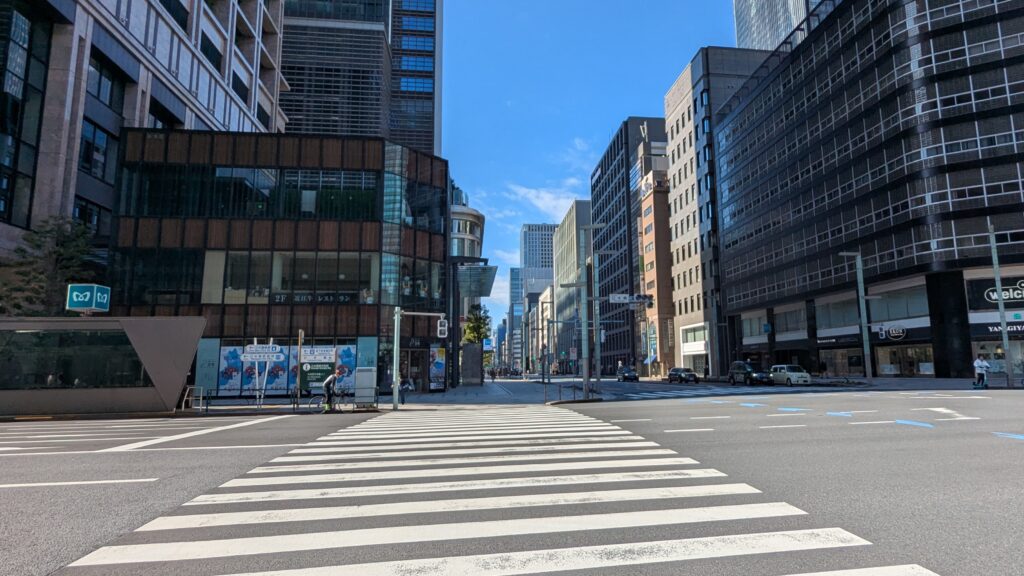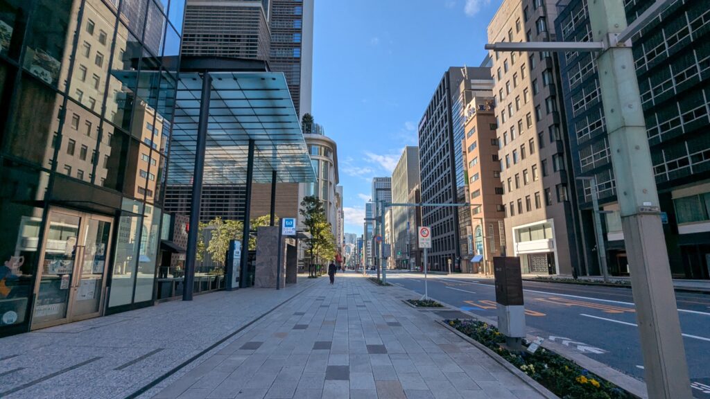 しかし人影はまばらで、ビルの圧倒的な存在感と静けさが入り混じった、ちょっと不思議な光景が広がっています。