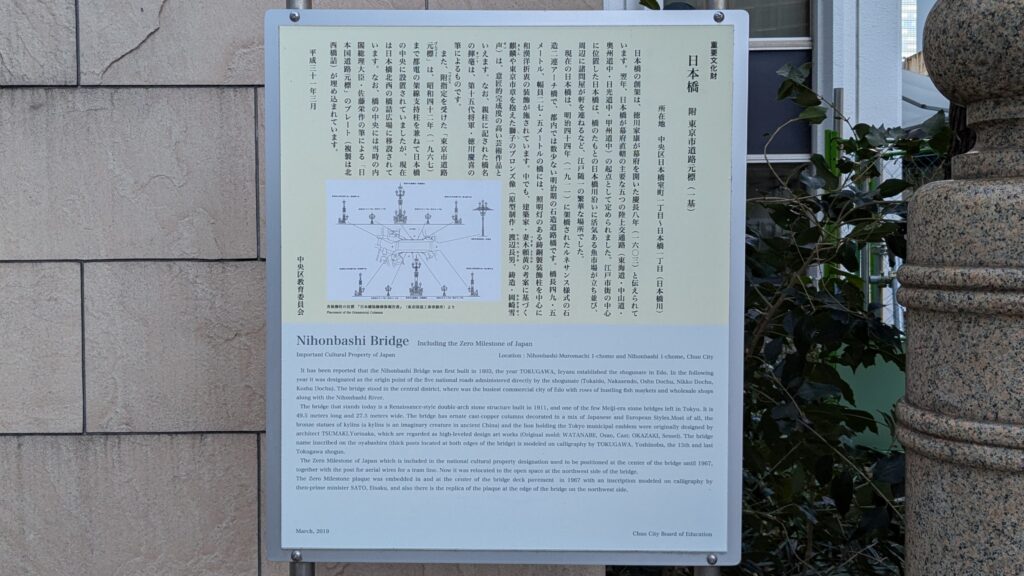 日本橋の南詰には、「日本橋由来記の碑」があります。ここは、江戸時代に幕府の法度などを掲示した「高札場」が置かれていた場所でもありました。甲州街道の旅のときは、先を急いでいてあまり意識せずに通り過ぎてしまいました。