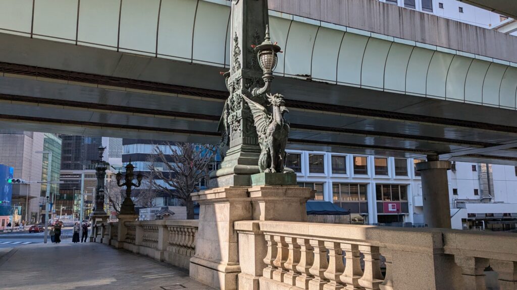 日本橋の中央に目を向けると、日本橋の高欄中央部にある青銅製の「麒麟の像」が姿を現します。いつ見てもかっこいいですね。少し怖い感じもありますが。