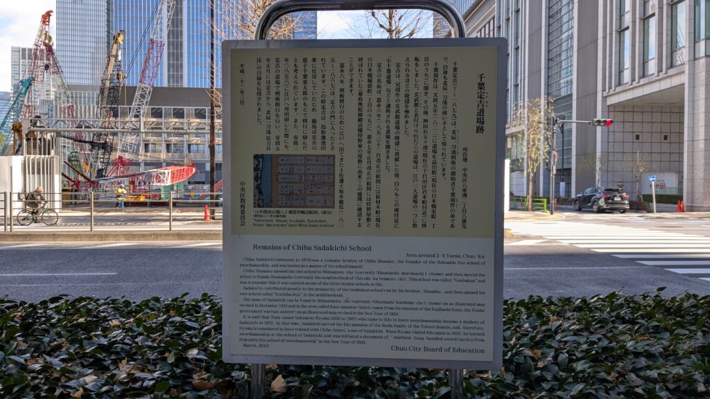 一区画先の交差点の角に、「千葉定吉道場跡」の案内板があります。