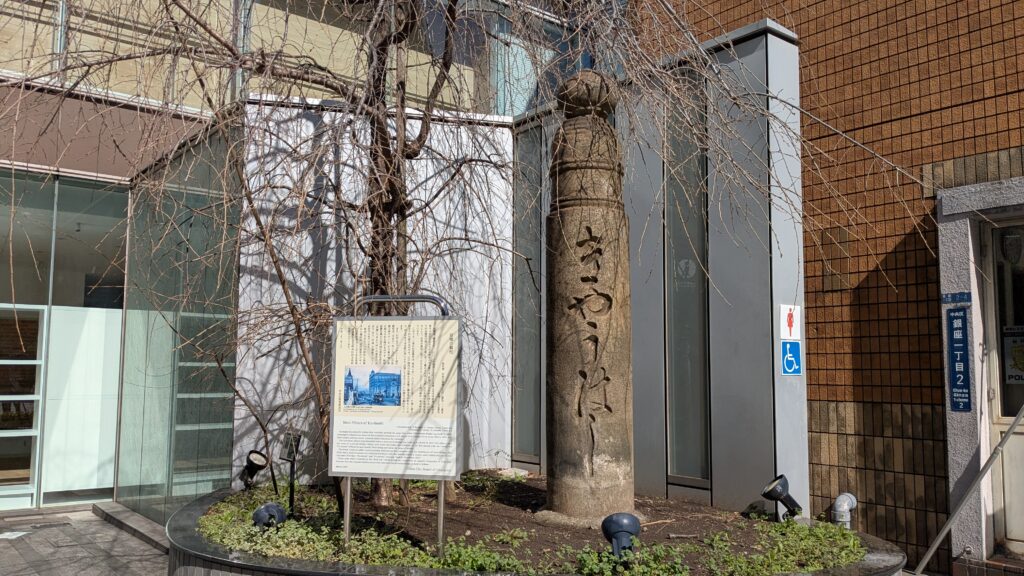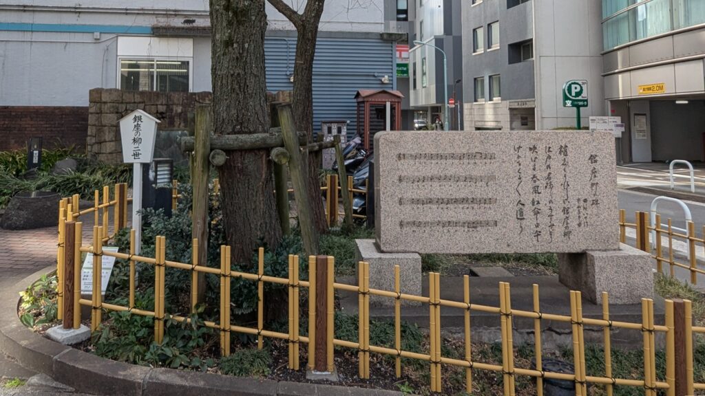 その隣には「銀座の柳碑」があります。昔の銀座には柳の木が並んでいましたが、関東大震災の火災でほとんど焼けてしまいました。今では、銀座といえば柳並木というイメージはあまり湧かなですね。