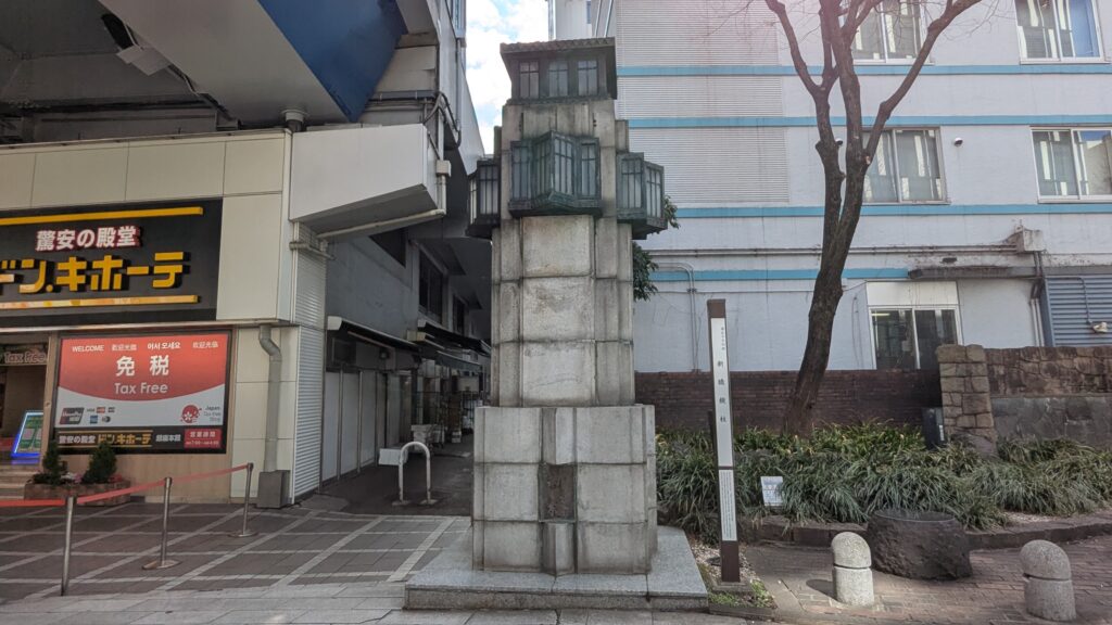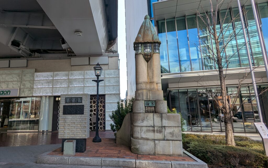 陸橋をくぐってすぐ「新橋の親柱」があります。