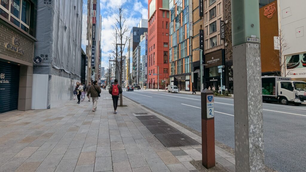 道を挟んだ交番の隣にも、歴史の証人である「京橋」の親柱が静かに佇んでいます。かつてここを流れていた京橋川を想像するのは難しいほど、今の銀座は洗練されていますが、こうした石碑が点在しているおかげで、ここが「街道」であることを思い出させてくれます。