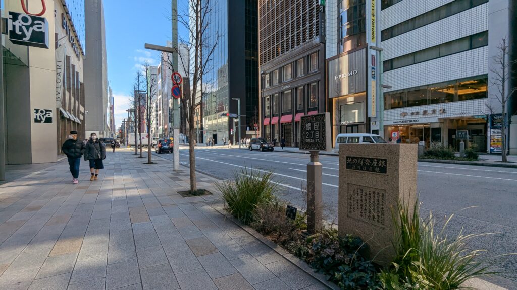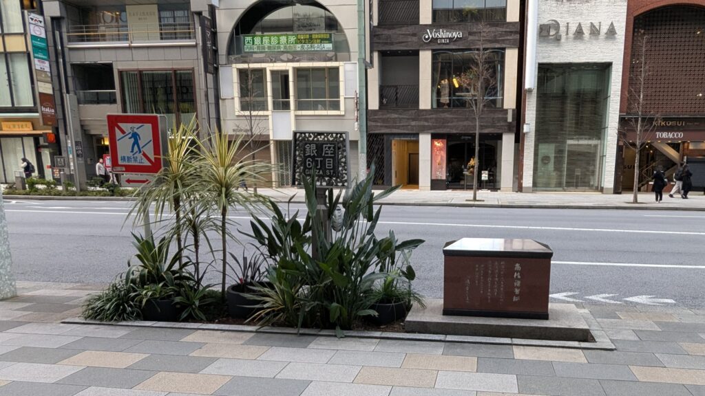 高級ブランドショップの重厚なビル群に見惚れながら歩いていると、突如として「銀座発祥の地碑」が現れます。