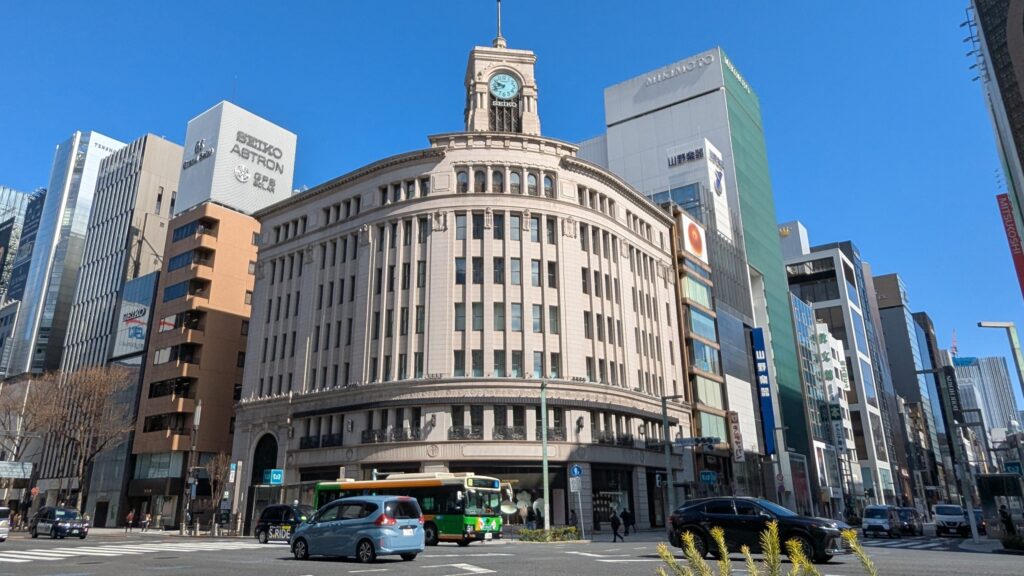 晴海通りと中央通りが交差する、銀座四丁目交差点です。銀座の中心地です。