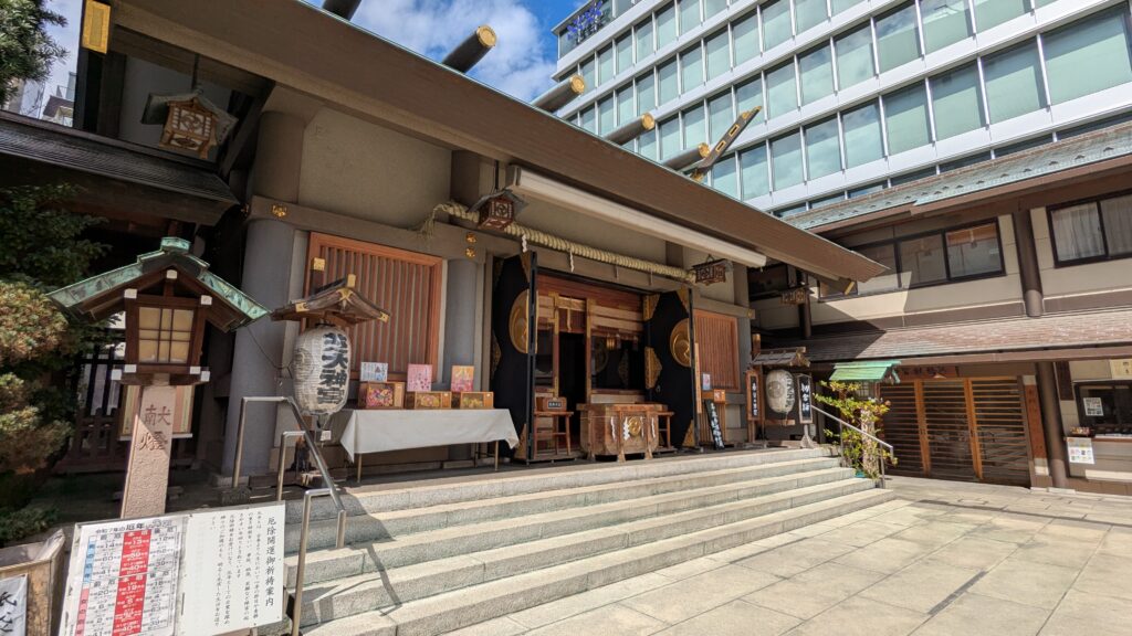 新橋の鎮守。商売繁盛や安全祈願を目的に多くの参拝者が訪れます。江戸時代からの歴史を持ち、周囲がビジネス街に囲まれる中でも静寂で落ち着いた雰囲気を保っていますね。