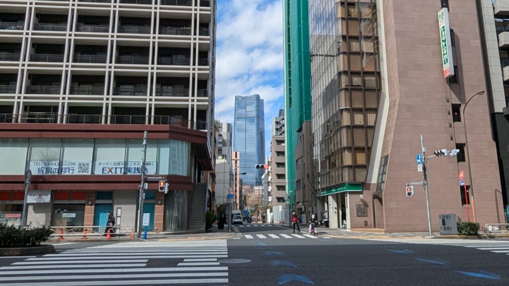 途中の交差点でふと右方向を見てみると、遠くに高い建物が見えました。