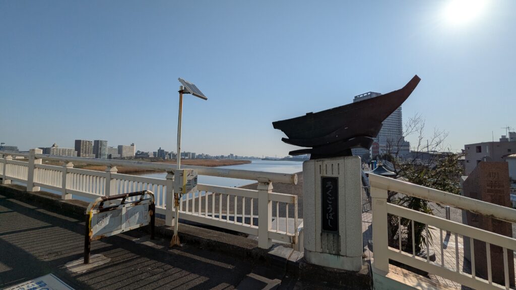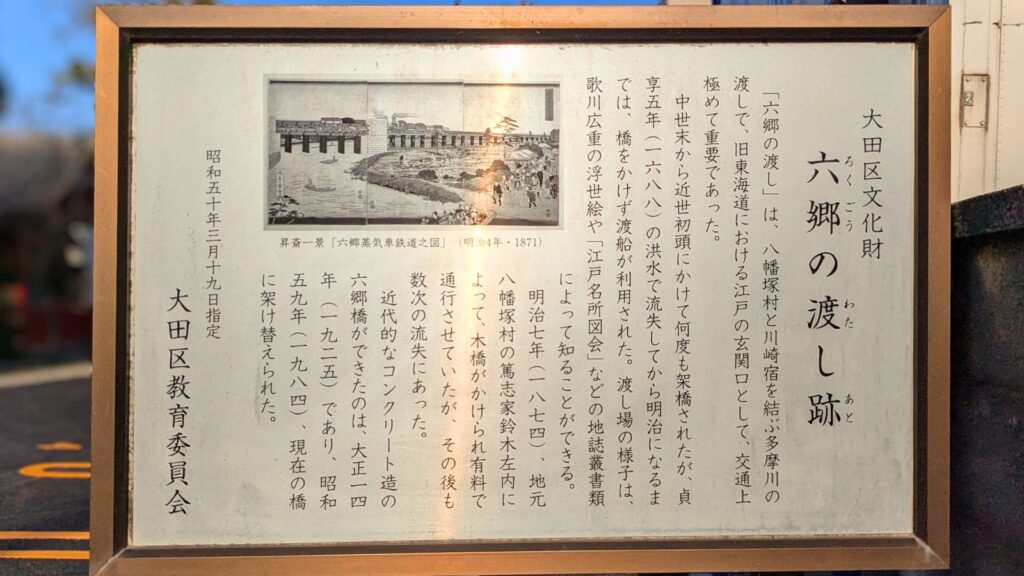 早速、六郷土手駅からすぐ、多摩川に向かった路地に入っていくと「六郷の渡し跡」案内板があります。多摩川を渡るための重要な拠点。1600年に徳川家康によって橋が架けられましたが、度重なる洪水により流失。その後約190年間は橋を持たず、渡船によって往来が行われていました。
