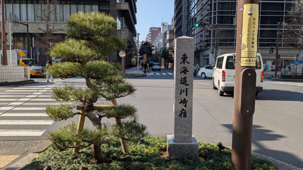 JR川崎駅から伸びる駅前通りを歩いていくと、砂子交差点に「東海道川崎宿」の碑が建っています。