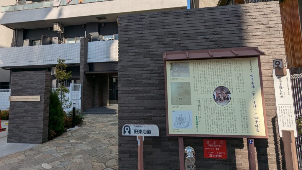 新しいマンションの玄関口に「田中本陣」があったことを示す案内板があります。