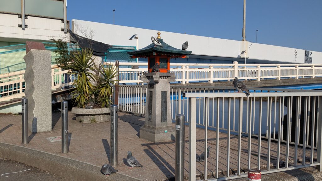 橋詰には「明治天皇六郷渡御碑」と、ハトまみれの「川崎大師灯篭」が建っていました。