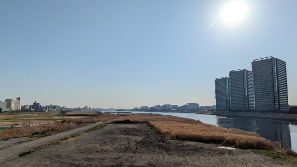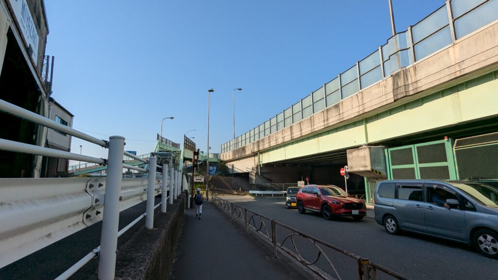 いよいよ1日目の終着点だった「六郷土手交差点」に到着!土手に出る階段を上り、橋側歩道を進んでいきます。