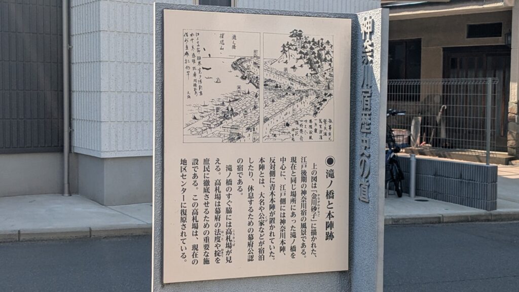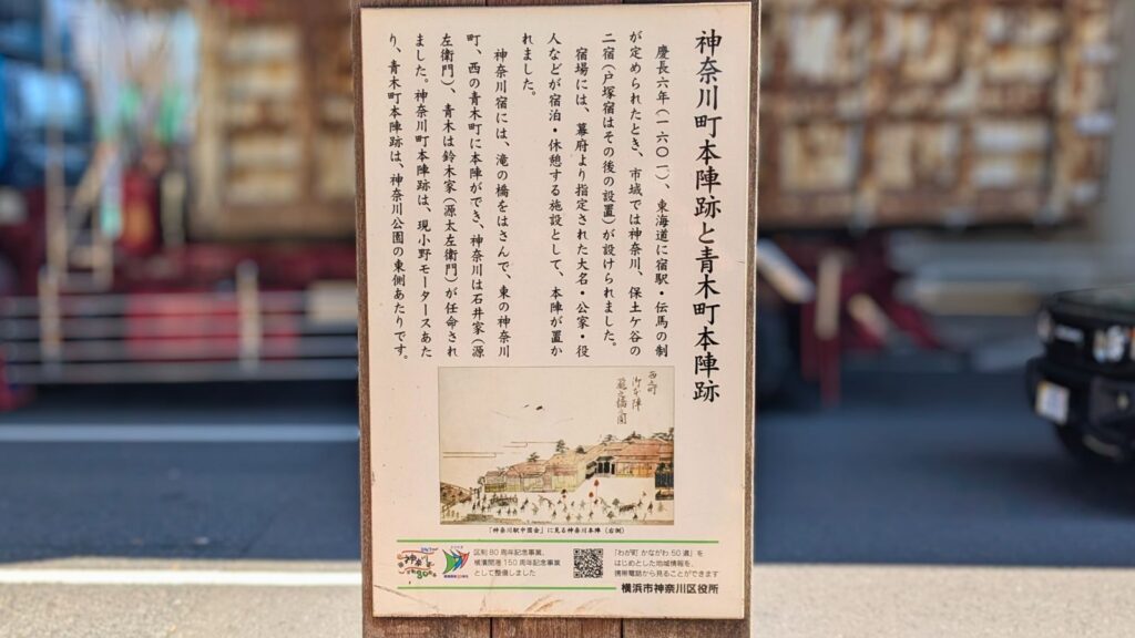 第一京浜道路(国道15号)に出ると、本陣跡の案内板が立っています。神奈川宿は「滝の橋」を境に、東側の神奈川町と西側の青木町に分かれており、それぞれに本陣が置かれていました。二つの町が合わさって一つの大きな宿場を形成していた、当時の規模の大きさが分かります。
