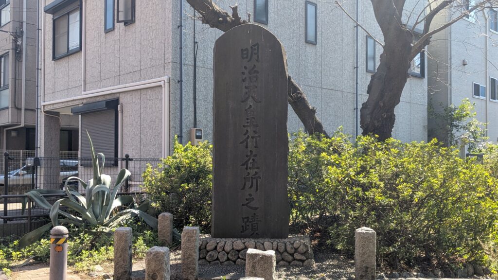 公園の一角に立つ「明治天皇行在所之蹟」の碑。明治天皇が東京へ向かわれる際、ここに二度も宿泊された記録が残っています。