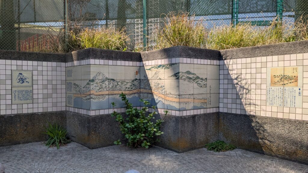 学校の敷地の角に、分間延絵図 を描いたタイルがあります。