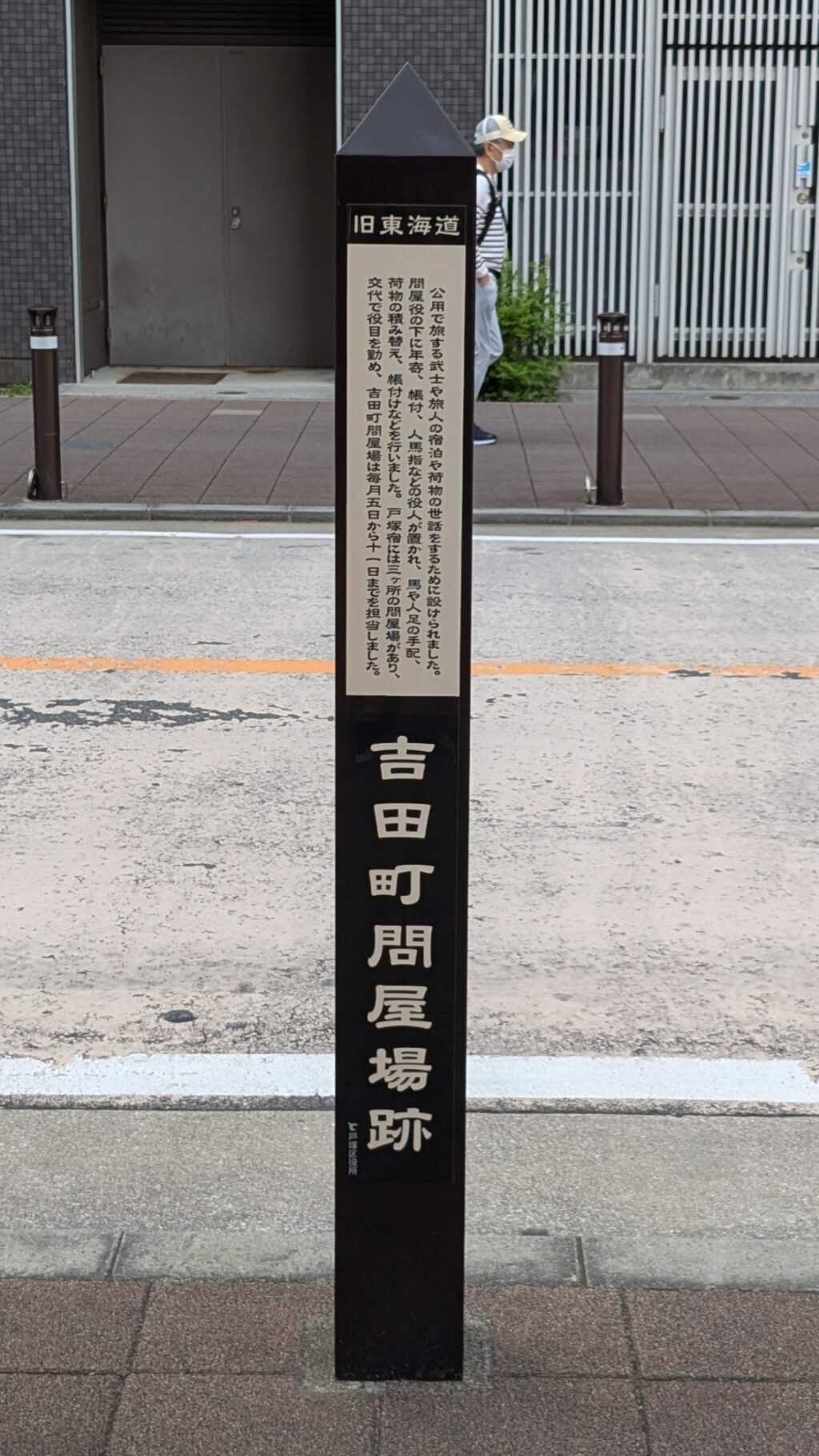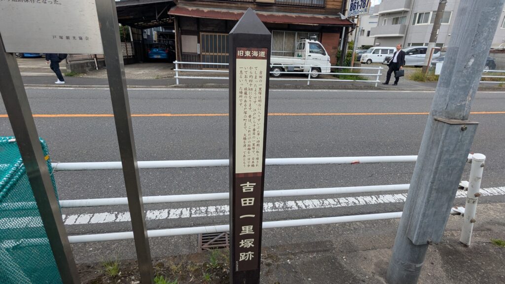 300メートルほど進むと、「吉田一里塚跡」の案内板がひっそりと立っています。ここは、日本橋からちょうど40kmの地点。昔の人は江戸日本橋からここまで1日で歩いたようです。