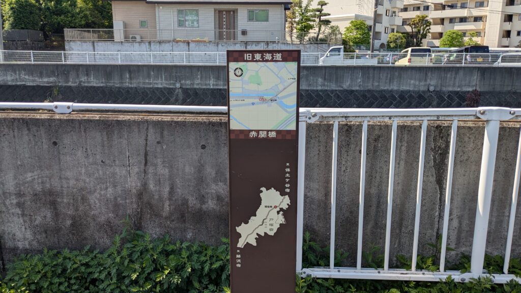 歩いていくと線路に突き当たります。跨線橋の下に、「横浜旧東海道 戸塚宿周辺散策案内」が設置されているのを発見しました。