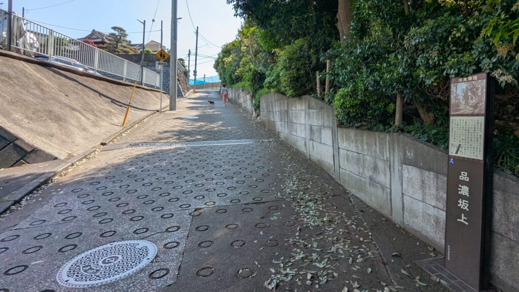 品濃坂上、かなりの急坂です。環状2号線の開通によって街道の流れが分断されてしまっています。かつての面影を感じながら歩いていると、坂の途中に環状2号線をまたぐ歩道橋が現れます。ここを渡って、昔の街道のラインをたどっていきます。