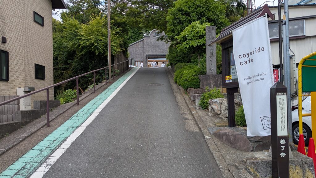 橋を渡って左手の道に入ると、すぐ右手に見えてくるのが「善了寺(ぜんりょうじ)」です。坂道を少し上った先に、本堂が静かにたたずんでいます。