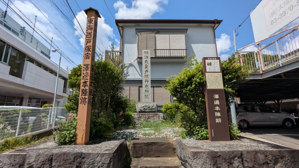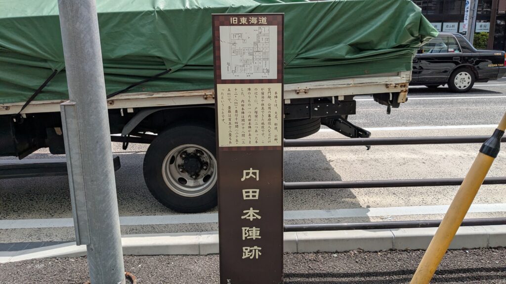 駅前交差点の一角に、「内田本陣跡」の案内板を見つけました。少し目立ちにくい場所にあります。そのまま通りを歩いていくと、次々と「脇本陣」や「澤邊本陣跡」の案内板も登場。澤邊本陣跡には、明治天皇が宿泊された石碑もたっていました。