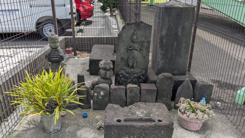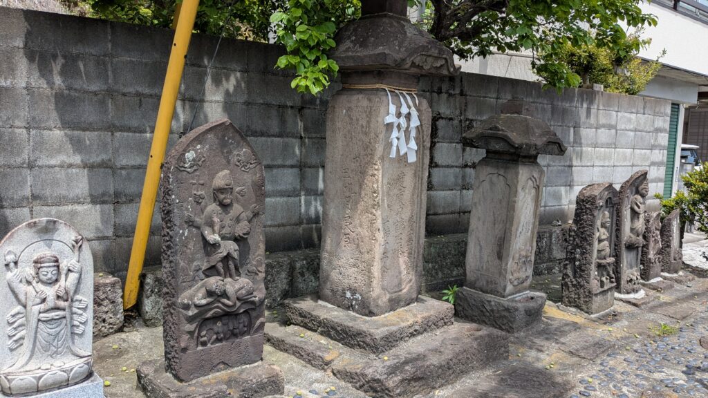 浅間神社から少し進んだ、歩道橋のたもとに石仏石塔が集められていました。