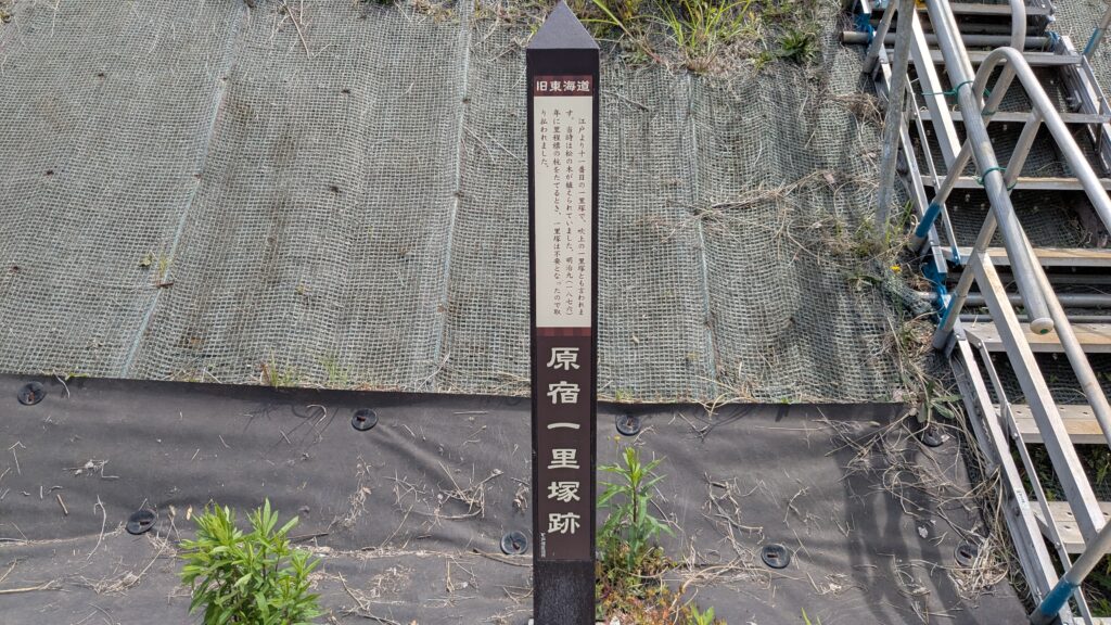 しばらく続く工事現場に突然現れた原宿一里塚の案内板です。