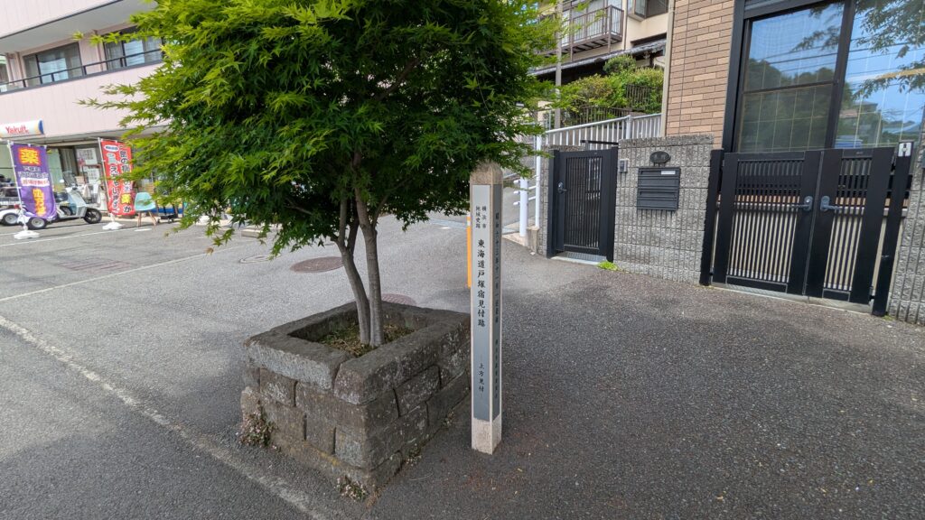 冨塚八幡宮を過ぎて、ほどなくするコンビニの敷地内に「上方見附跡」が現れます。戸塚宿の京都側出入口です。