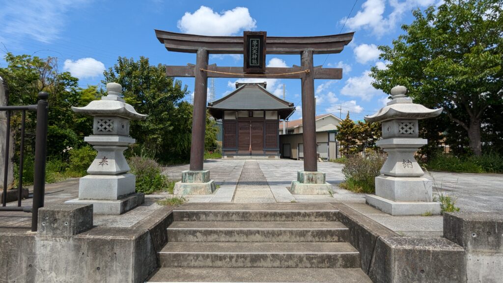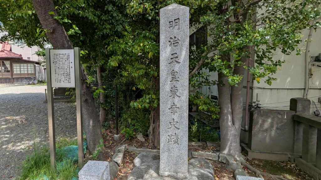 鳥居を抜けた右手には「明治天皇東幸史跡」が立っています。天皇巡幸の際、境内に内侍所が奉安されたということです。さらに右奥に開けていて、集会所があります。