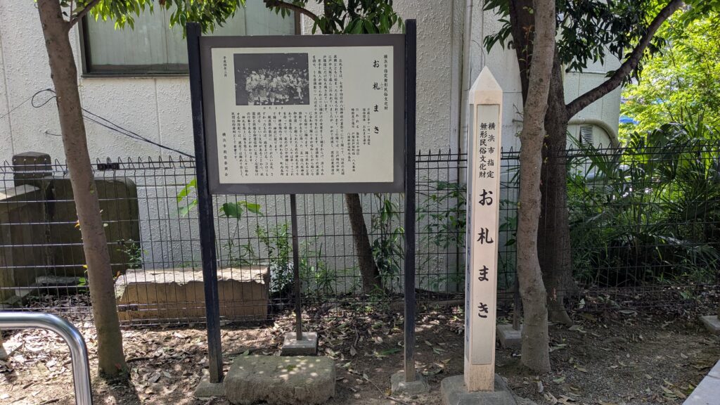 左手には「お札まき」という行事の案内板がありました。300年以上続く伝統的な祭りで、男性が女装して札をまきながら練り歩き、疫病除けや子どもの健康を願う行事。横浜市指定無形民俗文化財となっています。