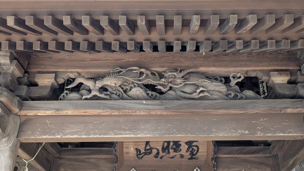 石段を登った先にある山門です。龍の彫刻は左甚五郎の作と伝えられています。