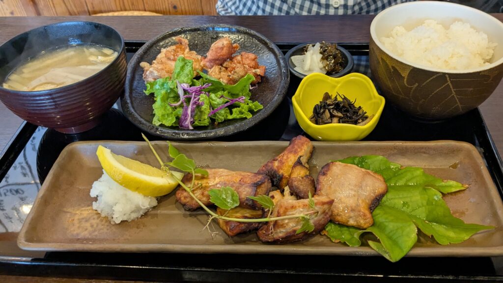夫さんは「豚肉と紅生姜の竜田揚げ定食」をチョイス。衣はカリッと揚がっていて、中からはジューシーなお肉と紅生姜の香りが広がり、大満足の一皿だったんだブ。私は「から揚げとまぐろの味噌漬け定食」を注文。どちらも丁寧に仕込まれていて、特にまぐろの味噌漬けはご飯がどんどん進む味わいだったんだブ。さらに、地元の常連さんで賑わう店内はアットホームな雰囲気で、初めてでも昔から通っていたような心地よさを感じられたんだブ。まさに旅先で偶然見つけた「当たり」の一食ってやつだブ!
