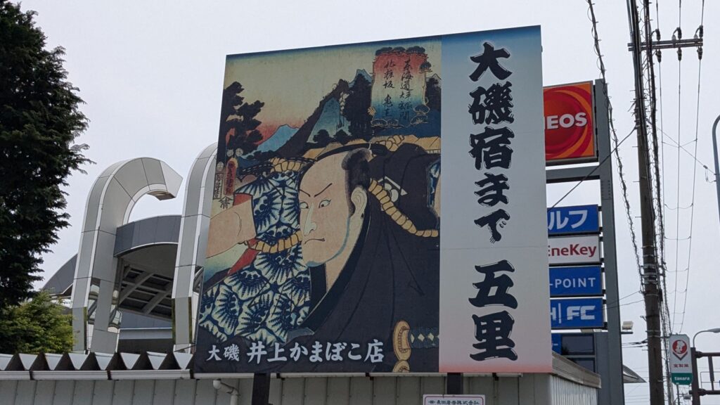 「大磯宿まで五里」の看板です。かまぼこ屋さんの広告のようですが、あと20kmということですね。ちょっと広告が前すぎではないですか。