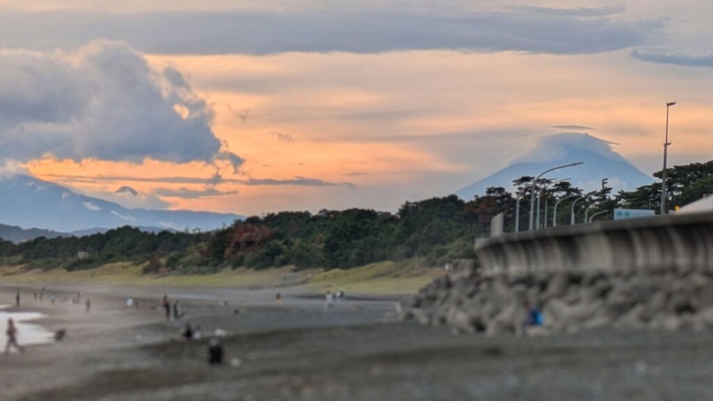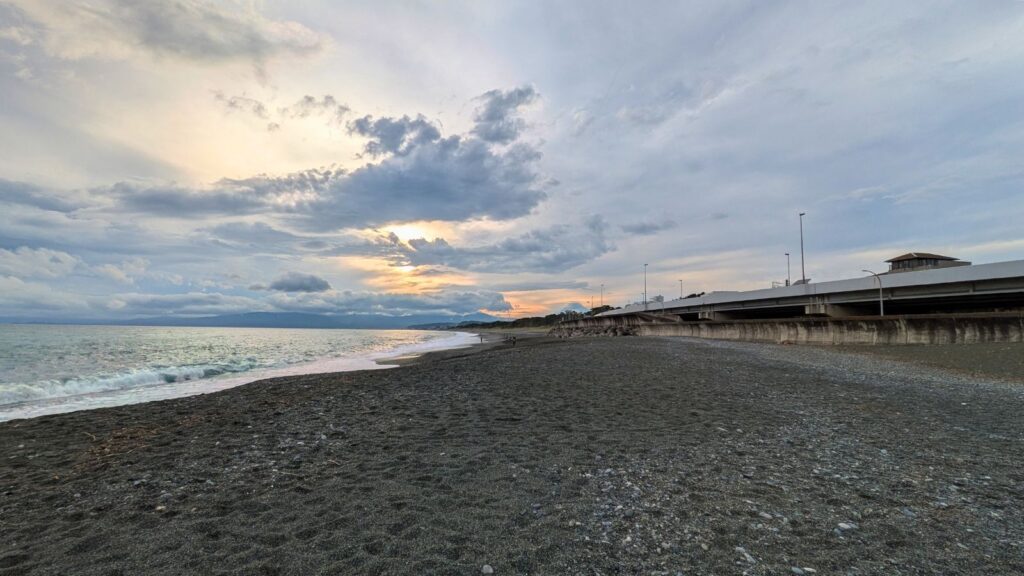 東海道の歩き旅で、まともに海岸線から海を見渡すことがなかったので、地球の果てが見渡せるこの景色に、心から癒されました。西湘バイパスの向こうには雄大な富士山も見えて、今日の旅もあと少し、頑張ろうという気持ちになります!
