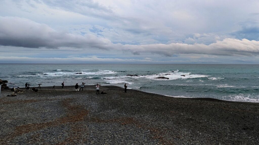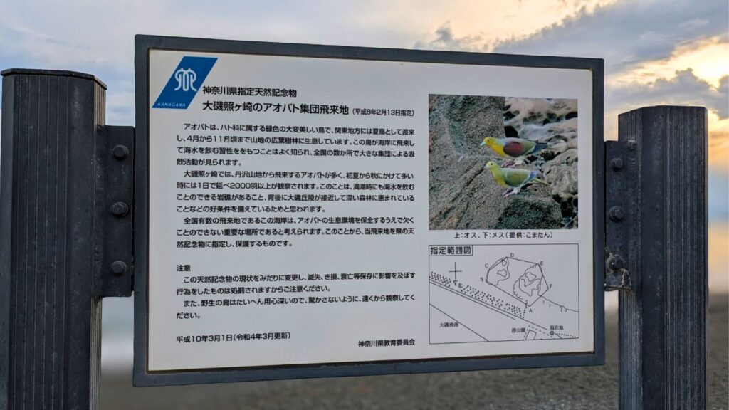 そして、照ヶ崎の海岸沿いは、アオバトの集団飛来地としても有名!陽が傾き始めていましたが、海水を飲むハトに魅せられたバードウォッチャーさんたちがまだ並んでいました。大群ではありませんでしたが、肉眼でアオバトの美しい姿を見ることができましたよ!