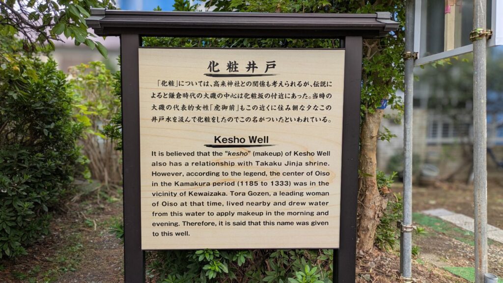 この化粧井戸は、曽我兄弟 兄・十郎祐成との悲哀物語で知られる虎御前もこの近くに住み、朝夕この井戸の水を汲んで、化粧をしていたことからこの名が付いたといわれています。