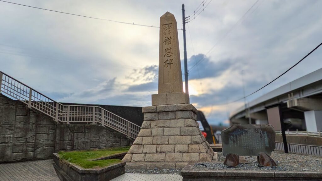 磯の香りが強くなり、海水の音とともに「松本先生謝恩碑」のモニュメントが見えてきました。ここはなんと、海水浴場発祥の地なんです!